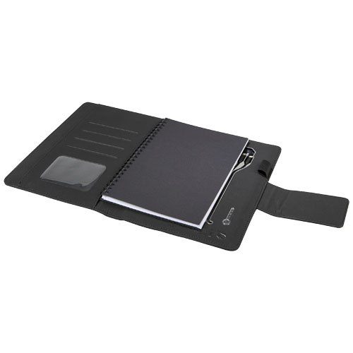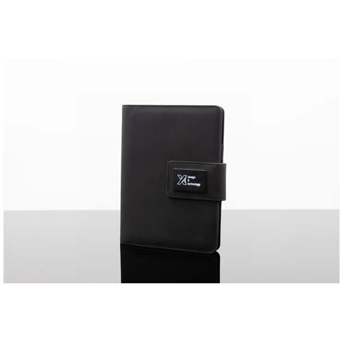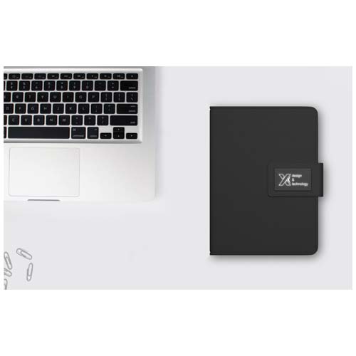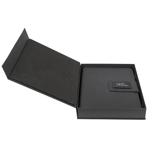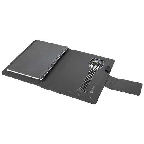 Notisbok med lysende logo og en 4000 mAh mobillader med en 3-i-1 integrert kabel (type C, Android og iPhone). Inngang: 5V/1A. Utgang: 5V/2A. Når den åpnes lyser den magnetiske stroppen opp. Denne funksjonaliteten virker i opptil 25 dager uten at enheten må lades! Den avtakbare A5-notisboken leveres med 30 sider resirkulert og bio nedbrytbart papir. Leveres med en gaveeske med magnetisk lukking, laget av resirkulert papir.