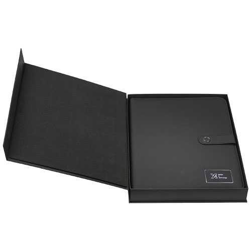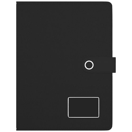 Notisbok med lysende logo og en 4000 mAh mobillader med en 3-i-1 integrert kabel (type C, Android og iPhone). Inngang: 5V/1A. Utgang: 5V/2A. Når notisboken åpnes lyser logoen opp. Denne funksjonaliteten virker i opptil 25 dager uten at enheten må lades! Den avtakbare AA-notisboken leveres med 30 sider resirkulert og bio nedbrytbart papir. Leveres med en gaveeske med magnetisk lukking, laget av resirkulert papir.