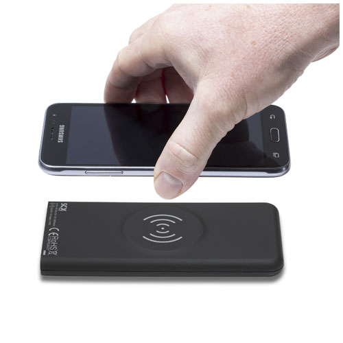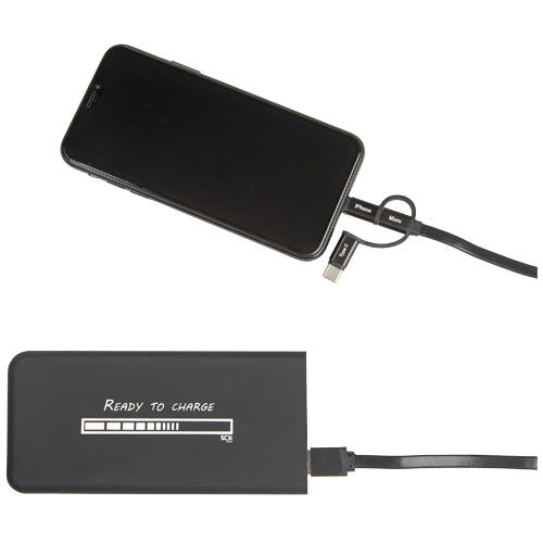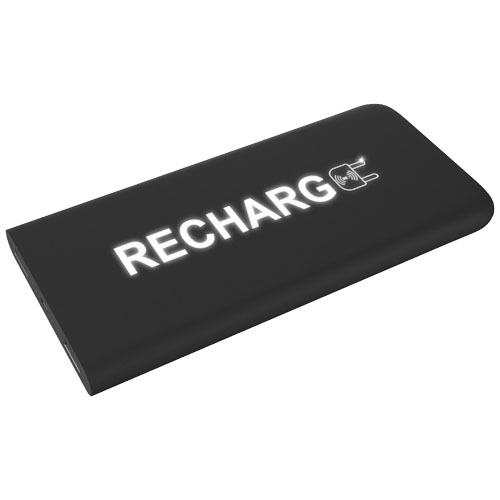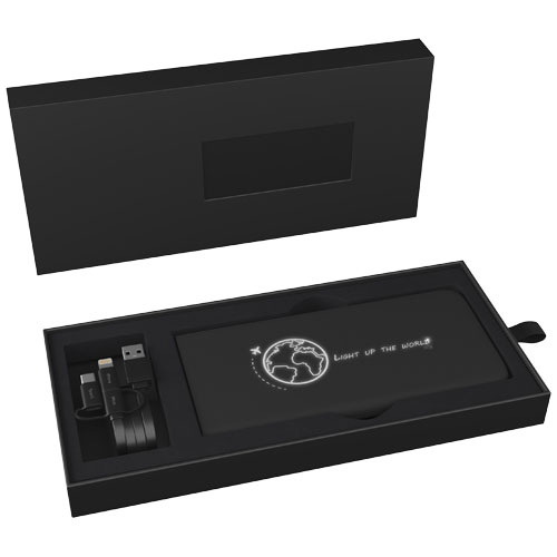 5000 mAh trådløs mobillader i gummi med lysende logo, en 3-i-1 resirkulert PET plastkabel (type C, Android og iPhone) og antibakteriell behandlling. Enheten lyser opp i 30 sekunder når den blir berørt eller når den lades. Kapasitet: 5000 mAh. Inngang: 5V/2,4A (mikro). Utgang: 5V/2,4A (USB). Trådløs utgang: 5V/2A max. frekvens: 110 kHz – 205 kHz. Nettovekt: 148 gram. Størrelse: 140 × 67 × 11,8 mm. Leveres med en gaveeske laget av resirkulert papir.
