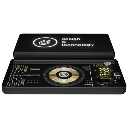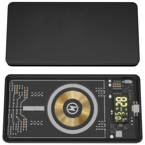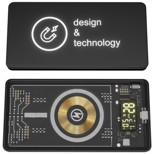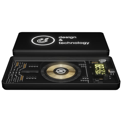 Magnetisk trådløs 5000 mAh mobillader (14 x 7 x 1,3 cm) med 5 W trådløs ladefunksjon, digital skjerm og USB Type-C utgang/inngang. Teknologien til denne mobilladeren vises på baksiden takket være det gjennomsiktige dekselet som viser kretskortet. Forsiden har en myk gummifinish med mulighet for gravering av lysende logo. Mobilladeren har dobbel USB 2A utgang og er laget av minst 50 % resirkulert ABS plast. Hvis telefonen ikke har MagSafe teknologi (fra og med iPhone 12), kan den magnetiske ringen (inkludert) festes på baksiden av telefonen for å gjøre den kompatibel med den magnetiske holderen. Leveres med en 3-i-1 (Type C, Micro USB, iPhone) ladekabel laget av resirkulert PET. Pakket i en gaveeske (20,1 x 10 x 2 cm) med magnetisk lukking. Inkluderer 3 års garanti.