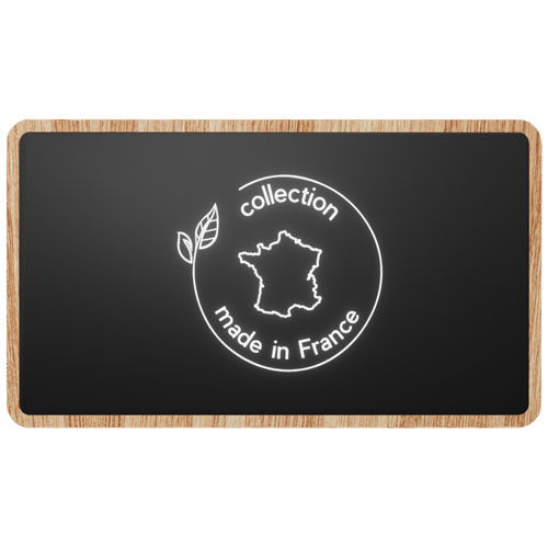 5000 mAh powerbank produsert i EU av fransk eiketre med soft touch finish. Mobilladeren har en Type-C inngang/utgang, og kan også brukes som en trådløs ladestasjon for Qi-kompatible enheter. Takket være ristefunksjonen lyser logoen i 30 sekunder når strømbanken håndteres, og logoen forblir tent når den lades. Leveres med en 3-i-1 rPET-ladekabel og er pakket i en gaveeske av resirkulert papir (16,5 x 8 x 2,7 cm), utstyrt med magnetisk lukking. Inkluderer 3-års garanti.