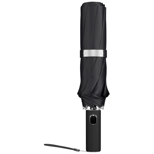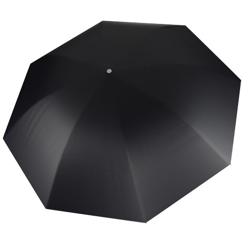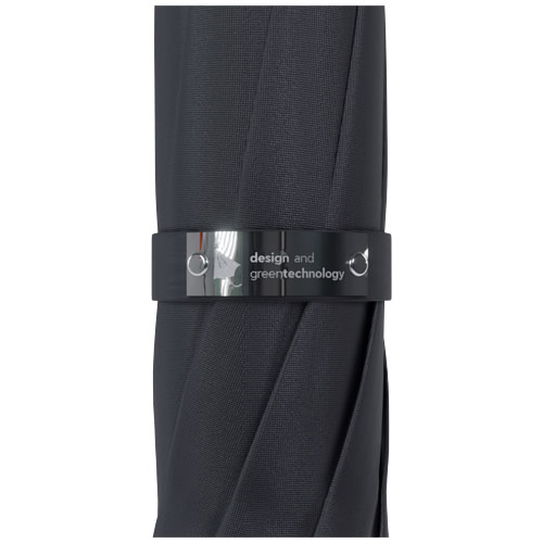 Halvautomatisk sammenleggbar paraply laget med rPET 210T-pongee og en glassfiberramme. Mykt håndtak med integrert trykknapp for rask åpning og lukking. Vindtett system for bedre vindmotstand takket være den fleksible rammen. Dette produktet kan tilpasses på den eksklusive metallplaten med knapper. Leveres med en paraplypose og leveres i en sylindrisk gaveeske av resirkulert papir (32 x 6,5 cm).