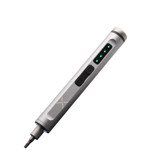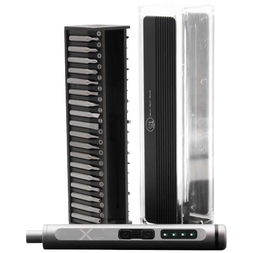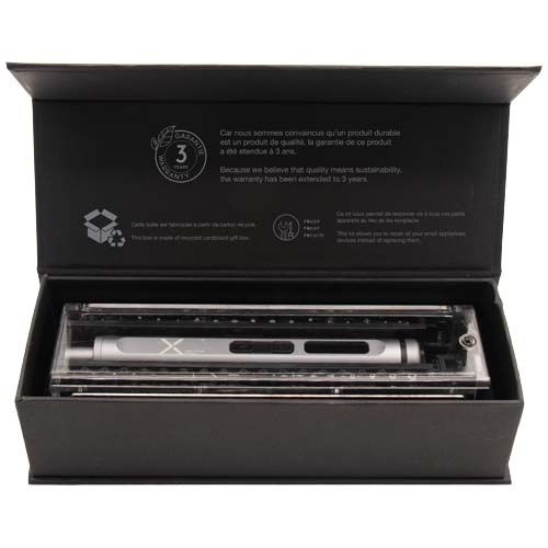 Sett med en elektrisk skrutrekker laget av aluminium og 40 bits for reparasjon av små apparater og andre DYI aktiviteter. Bitsene festes magnetisk til skrutrekkeren. Logoen «REUSE REPAIR RECYCLE» er gravert på oppbevaringsboksen. Leveres i engaveeske av resirkulert papp.