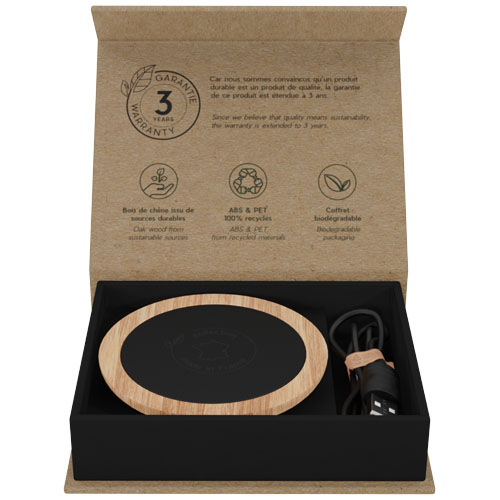 10 W trådløs ladestasjon laget av fransk eiketre og en myk gummifinish. Denne ladestasjonen er Qi-kompatibel og kan tilpasses med en opplyst logo. Leveres i en gaveeske av resirkulert papir med magnetisk lukking.
