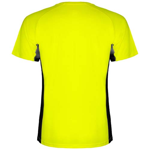 Teknisk og pustende materiale. En kombinasjon av to polyesterstoffer: Hovedmateriale i "birds eye" og sidepaneler meshlignende materiale. Rund hals med innvendige forsterkede sømmer. Avtakbar etikett.