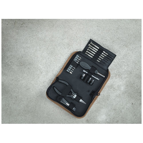 Spike verktøysettet kombinerer praktisk, holdbarhet og bærekraft i én vakker pakke. Oppbevaringsposen av kork er ikke bare visuelt tiltalende, men også miljømessig ansvarlig uten at det går på bekostning av kvalitet eller ytelse. Inne i posen finner du et sett med 24 nødvendige verktøy laget av karbonstål og RCS sertifisert resirkulert plast: 1 kniv for rene kutt og presis trimming, 6 presisjonsskrutrekkere for ømfintlige oppgaver, 10 skrutrekkerbits, 1 skrutrekkerhåndtak med komfortabelt grep, 1 forlengelsesstang for vanskelig tilgjengelige områder, 4 stikkontakter for ulike bruksområder og 1 lang nesetang for å gripe og bøye. Siden kork er et naturlig produkt, kan det være små variasjoner i elementenes farge og størrelse, noe som kan påvirke det endelige printresultatet. Pakket i en STAC gaveeske fra bærekraftige kilder.