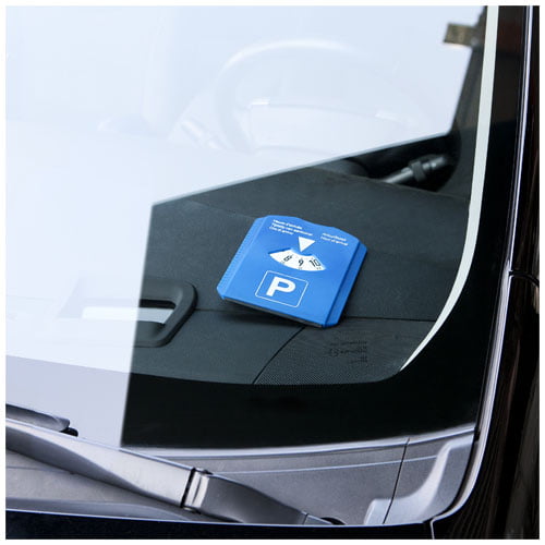 Parkeringsskive med isskrape, gummiskrape, pollett til handlevogn og mønsterdybdemåler. Skiven har et stort, hvitt logoområde på baksiden. «Ankomsttid»-tekst på framsiden finnes på hollandsk, engelsk, fransk, tysk og italiensk. Lokalt lovverk gjelder.