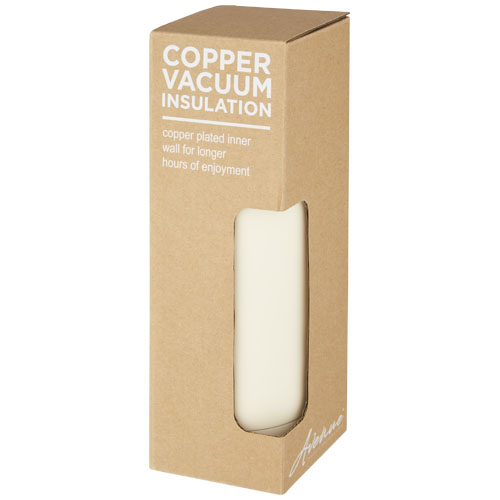 Stor kobber vakuumisolert flaske av rustfritt stål med et rent design. Den isolerte 18/8 rustfrie stålkonstruksjonen forhindrer kondens på utsiden av flasken, mens den trendy matte pulverspray finishen gjør den ekstra holdbar. BPA fri, testet og godkjent i henhold til tysk lovgivning for matsikkerhet (LFGB). Testet og godkjent for ftalater i henhold til REACH forskriftene. Volum 500 ml. Håndvask anbefales. Kommer i en hvit gaveeske i papp.