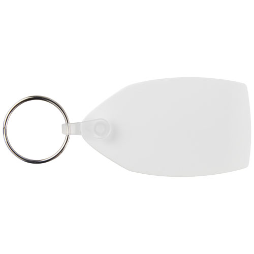 Hvit rektangulært nøkkelring i metall. Produktet har en flat profil, noe som gjør den ideell for utsendelse.